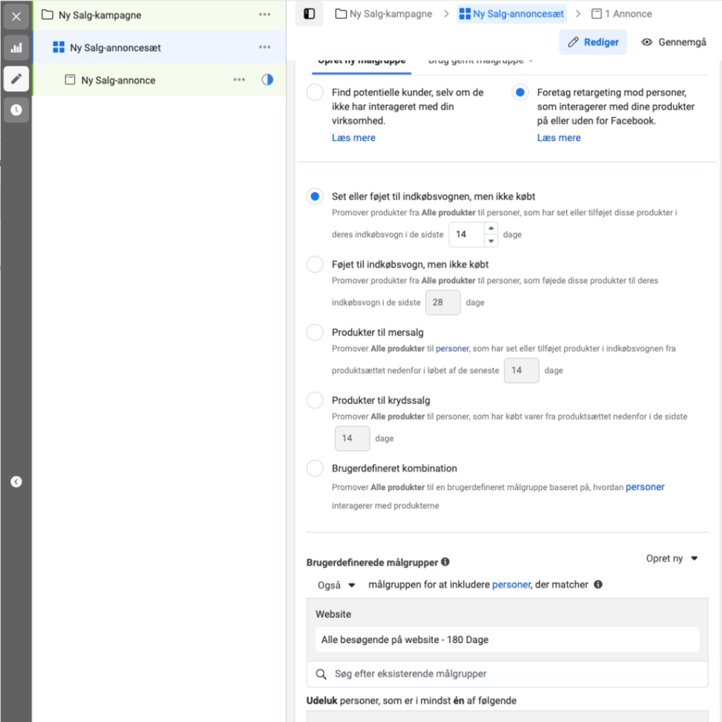Når det kommer til retargeting, har I mulighed for at vælge mellem to forskellige målgruppetyper. Den mest kendte er at lade Meta målrette kunder, som allerede har interageret med jeres produkter, enten på eller uden for jeres Meta-kanaler.