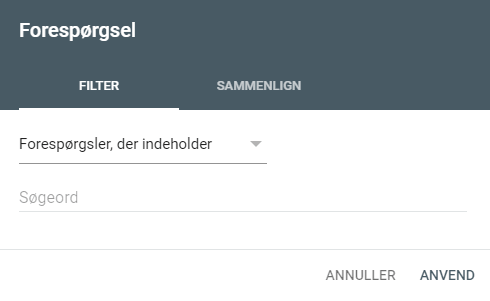 Ønsker vi at se, om brandkendskabet er steget, og vi deraf har fået flere brandede eksponeringer og klik til vores side, vil vi vælge “forespørgsler, der indeholder” og herefter skrive LAZZAWEB i feltet. Det kan også være, at vi ønsker at se på performance for generiske søgeord, og vi vælger derfor at ekskludere (forespørgsler, der ikke indeholder): LAZZAWEB for at se, om vi generelt er begyndt at performe på flere ikke-brandede søgeord.