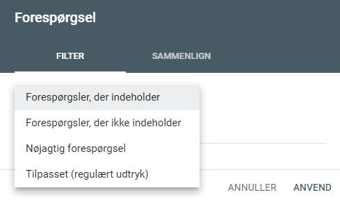 I visse tilfælde er der brug for at kigge på flere søgeord ad gangen, og til dette bruges Tilpasset (regulært udtryk), hvor det er muligt at skrive regex. Dette er et kraftfuldt værktøj, og den mest simple usecase er, at I ønsker at eksludere/inkludere flere termer eller sider på én gang. Dette gøres ved at tilføje | mellem hvert af søgeordene. Ønsker I eksempelvis at se alle søgninger, hvor SEO eller Google Ads indgår, vil I lave følgende regex: Google Ads|SEO